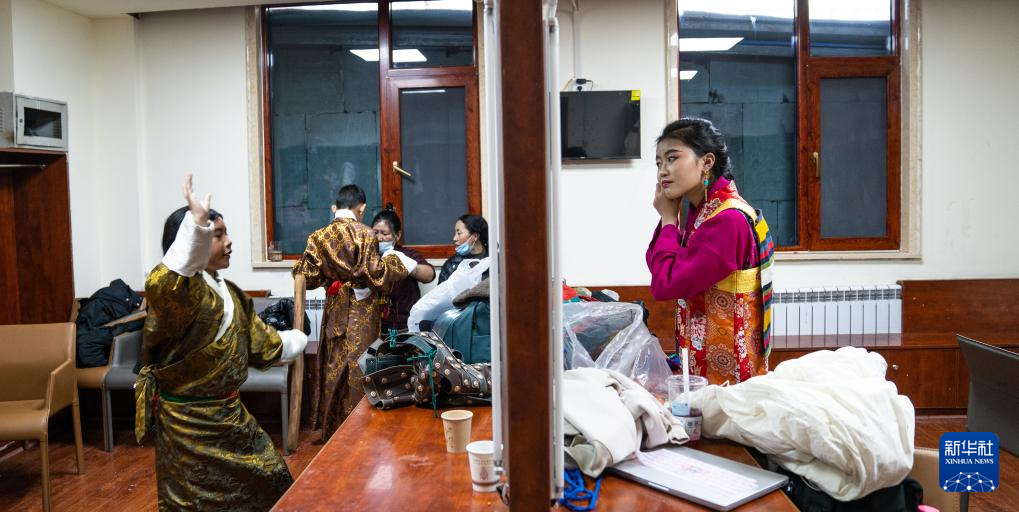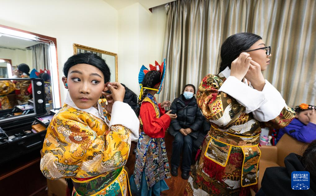 小演員在準備演出舞台劇藏戲《頓月頓珠》(2月11日攝)。新華社記者 丁增尼達 攝