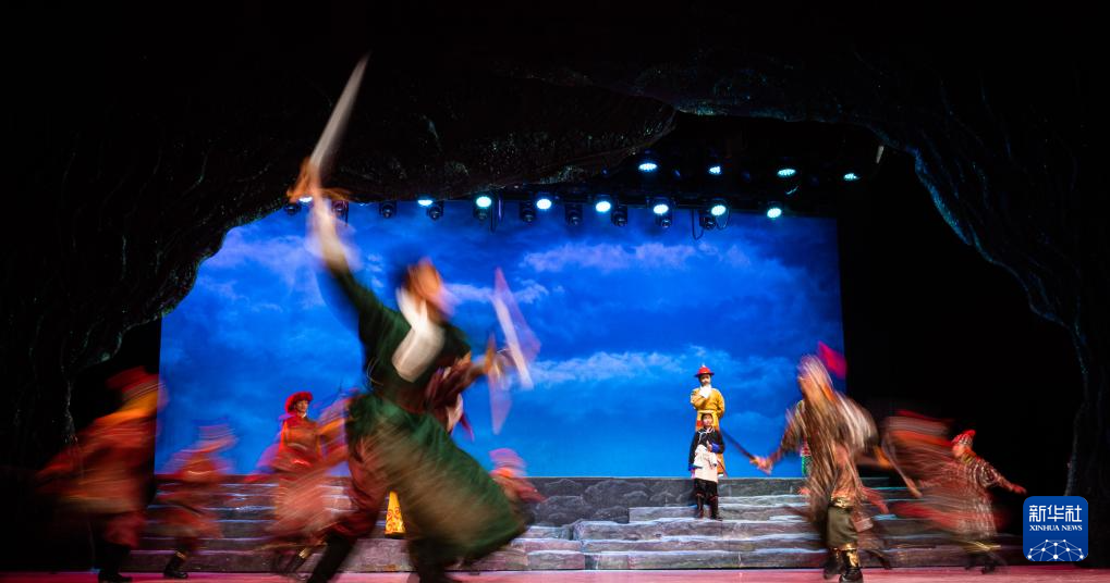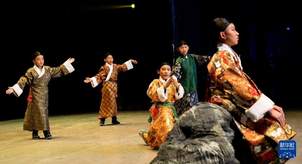 這是西藏首部少兒(er) 舞台劇藏戲《頓月頓珠》演出現場,羅桑朗覺(右三)在劇中飾演“頓月”(2月11日攝)。新華社記者 丁增尼達 攝