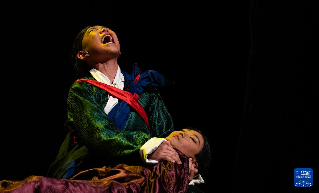 西藏首部少兒(er) 舞台劇藏戲《頓月頓珠》演出現場;羅桑朗覺(右)飾演“頓月”,旦增夢朗(左)飾演“頓珠”(2月11日攝)。新華社記者 丁增尼達 攝