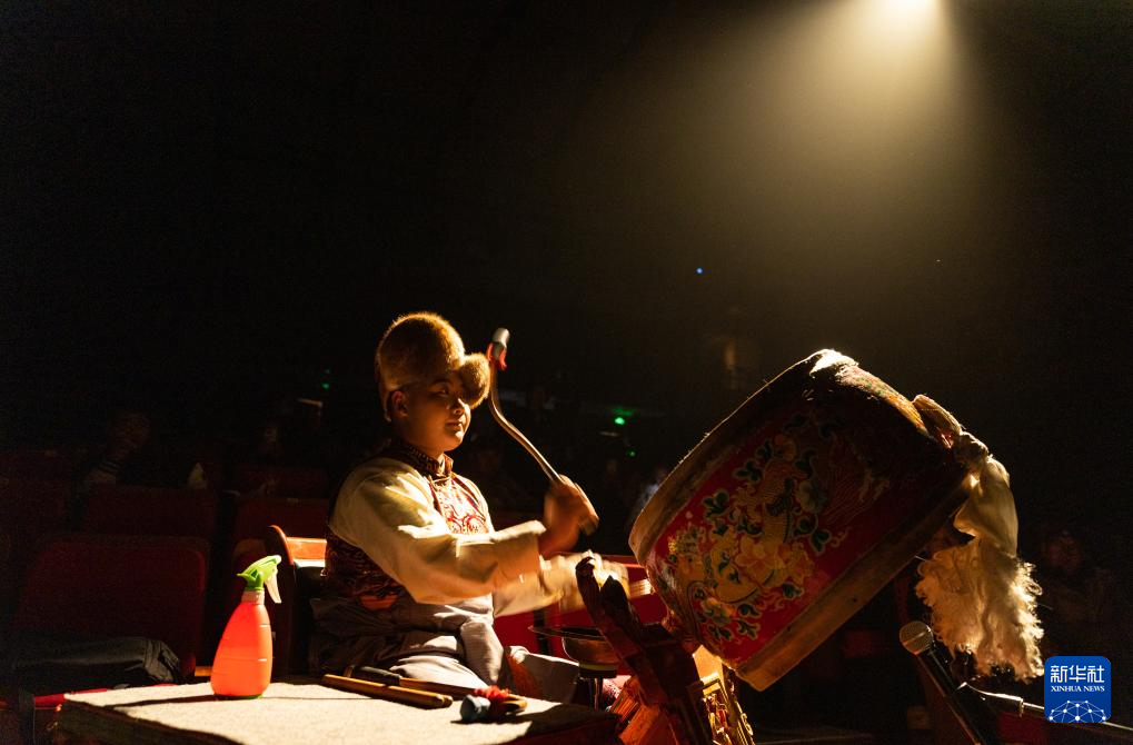 小演員敲鑼打鼓為(wei) 藏戲表演伴奏(2月11日攝)。新華社記者 丁增尼達 攝