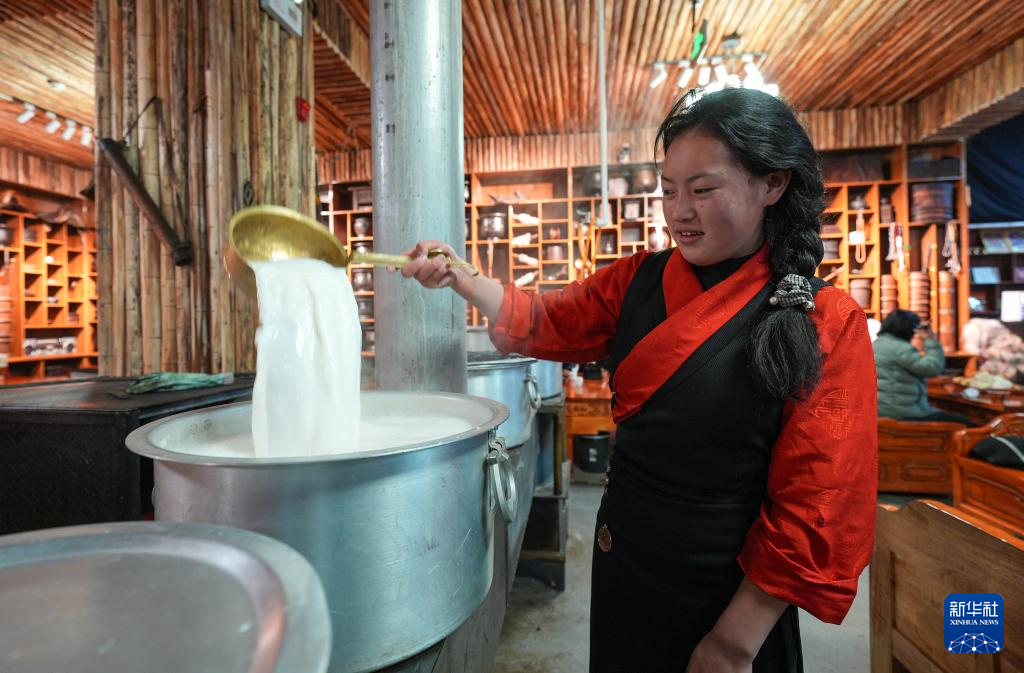 “牧人寶庫”藏式茶館服務員在熬製奶茶(2月13日攝)。新華社記者 晉美多吉 攝