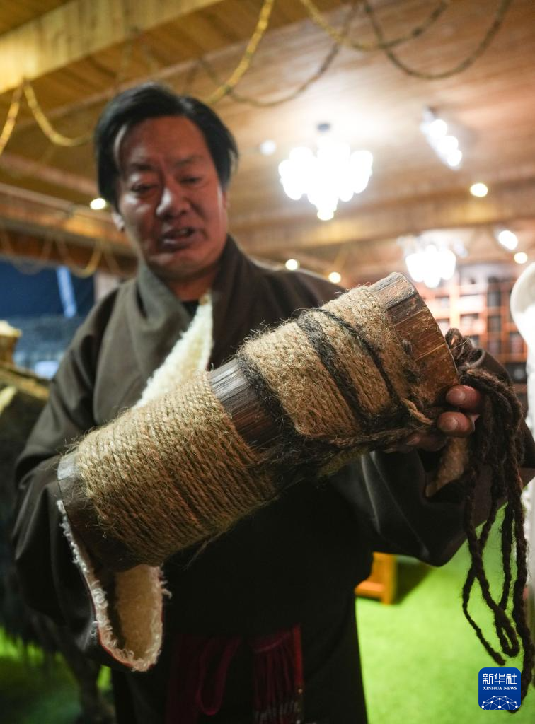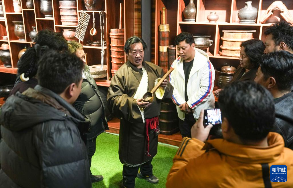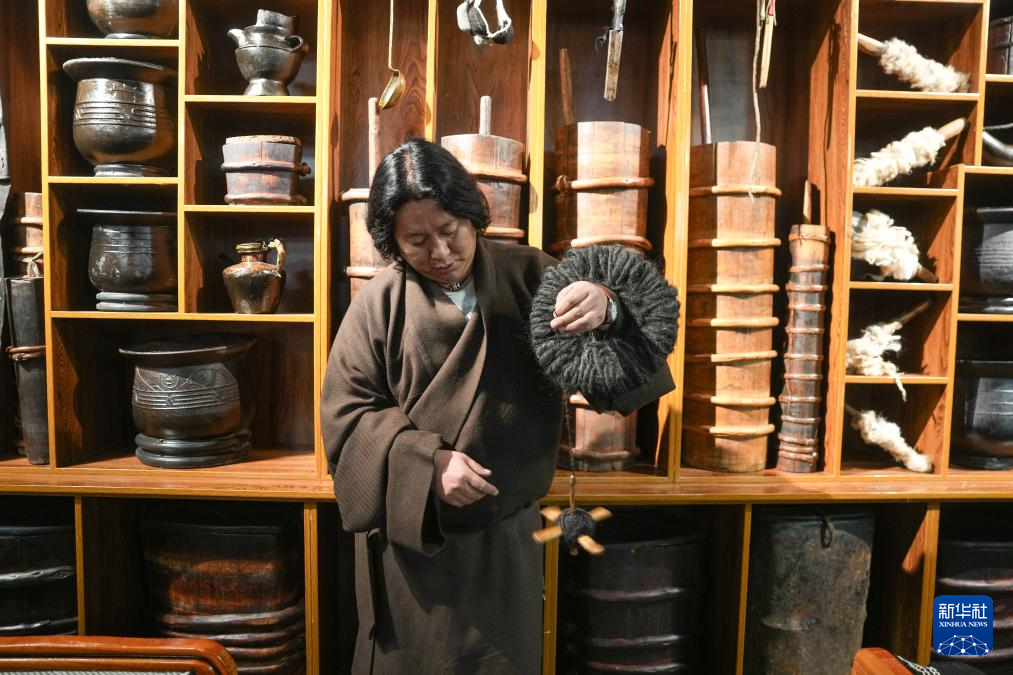 當地民俗專(zhuan) 家貢布洛旺在“牧人寶庫”藏式茶館展示擠羊奶用的木桶(2月13日攝)。新華社記者 晉美多吉 攝