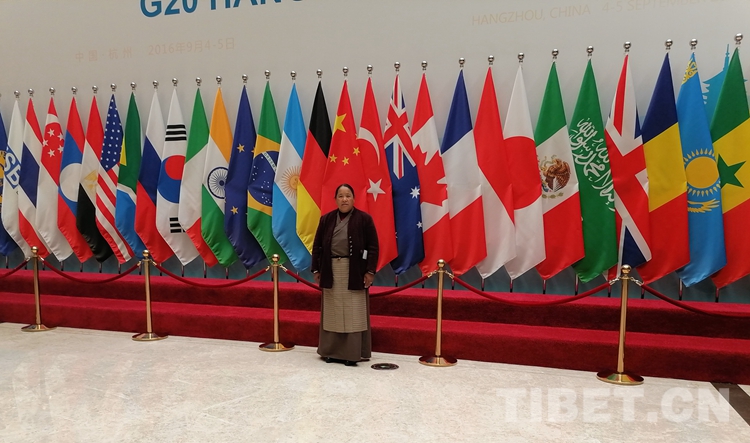 圖為(wei) 2019年12月瓊結縣政協組織政協委員到杭州視察工作時,桑吉在G20峰會(hui) 杭州主會(hui) 場留影。