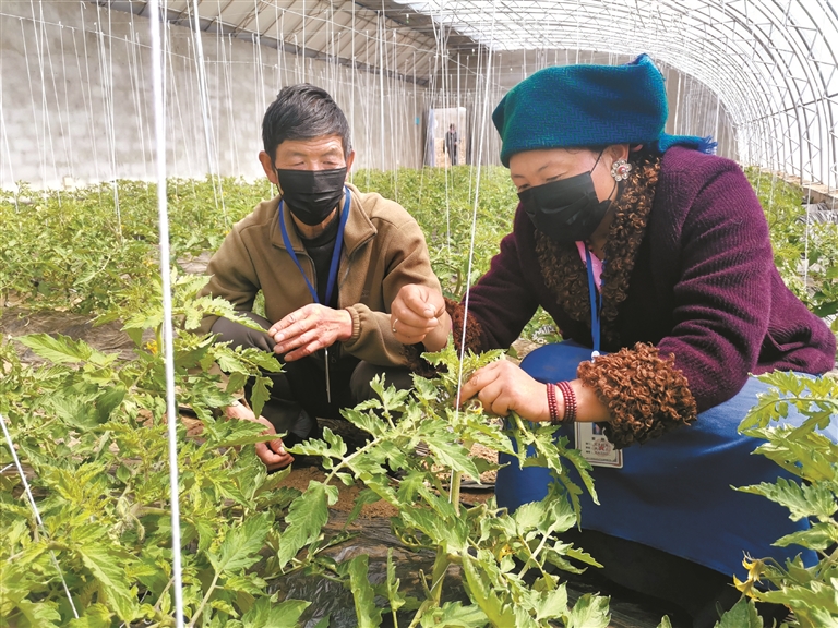 墨竹工卡縣易地扶貧搬遷戶央宗在技術員的指導下學習西紅柿掐苗掛藤技術