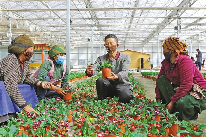 圖為(wei) 在林周縣陽光溫室示範園區,技術人員在指導村民種植花卉。 記者 央金 攝
