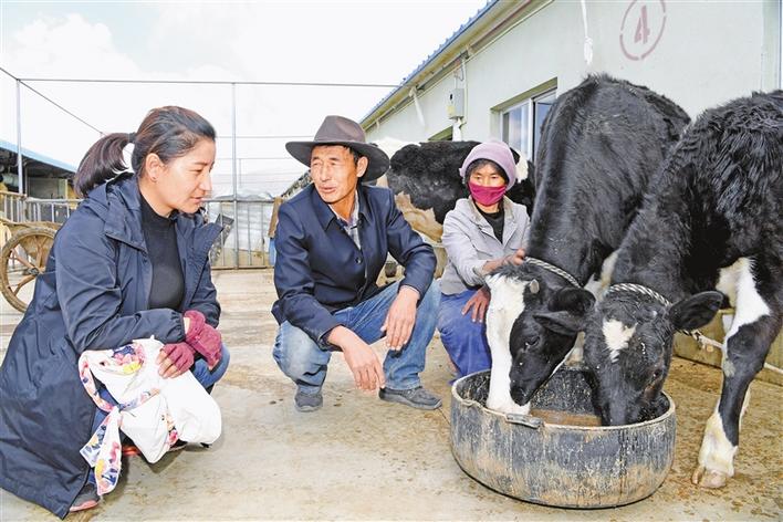 圖為(wei) 合作社致富帶頭人多布傑(中)在牛場內(nei) 查看奶牛飼養(yang) 情況。記者 李洲 次旺 攝