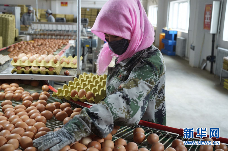 在德青源金雞扶貧產(chan) 業(ye) 園內(nei) ,工人正在挑揀雞蛋。新華社記者 朱藝琳 攝