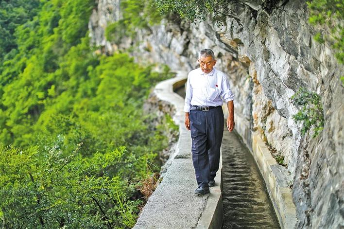 貴州遵義(yi) 播州區團結村老支書(shu) 黃大發沿著修建在絕壁上的“大發渠”巡查(2018年8月11日攝)。