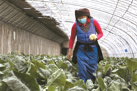 圖為(wei) 當地群眾(zhong) 在墨竹工卡縣現代農(nong) 業(ye) 示範園溫室大棚收花菜。 拉薩融媒記者 貢嘎來鬆攝