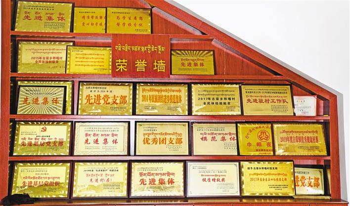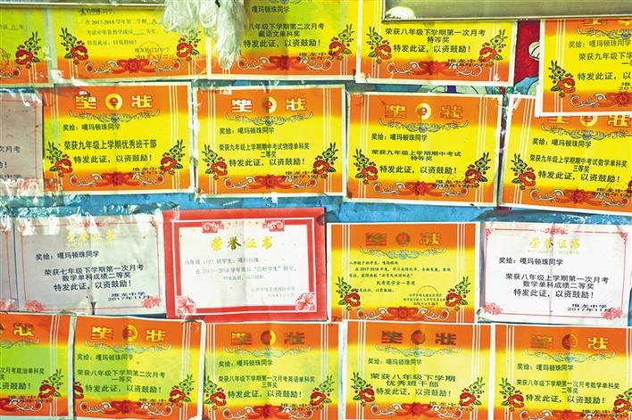 那嘎村脫貧戶紮西多吉家的獎狀牆。