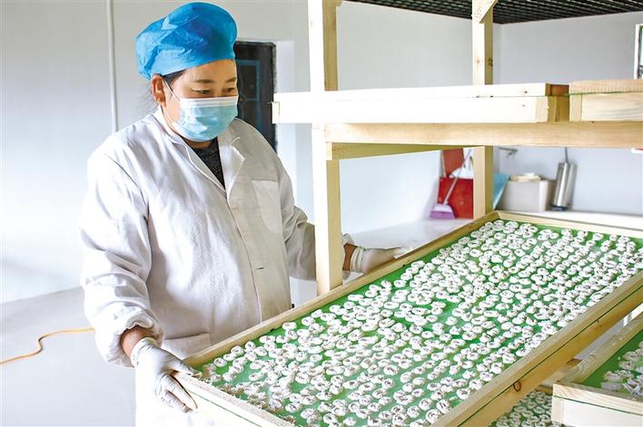 圖為(wei) 尼瑪在林周縣德爾康農(nong) 畜農(nong) 民專(zhuan) 業(ye) 合作社製作奶渣。 記者 央金 攝