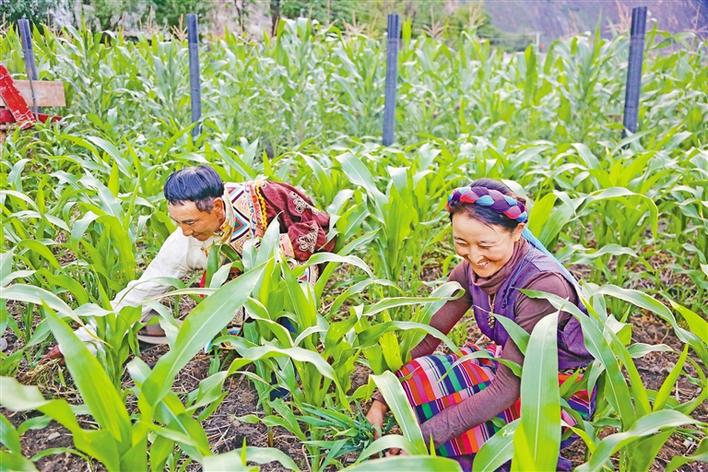 圖為(wei) 察瓦龍鄉(xiang) 目巴村村民德青永宗(右)在玉米地裏除草。記者 王珊 攝