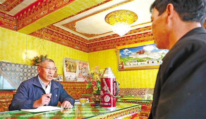 通嘎社區“四講四愛”宣講員阿瓊在了解米瑪脫貧致富的故事。記者 劉斯宇 格桑倫(lun) 珠 攝