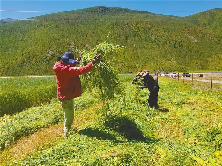 圖為(wei) 索縣榮布鎮農(nong) 牧民群眾(zhong) 正在人工種草基地收割燕麥草。記者 萬(wan) 靖 攝