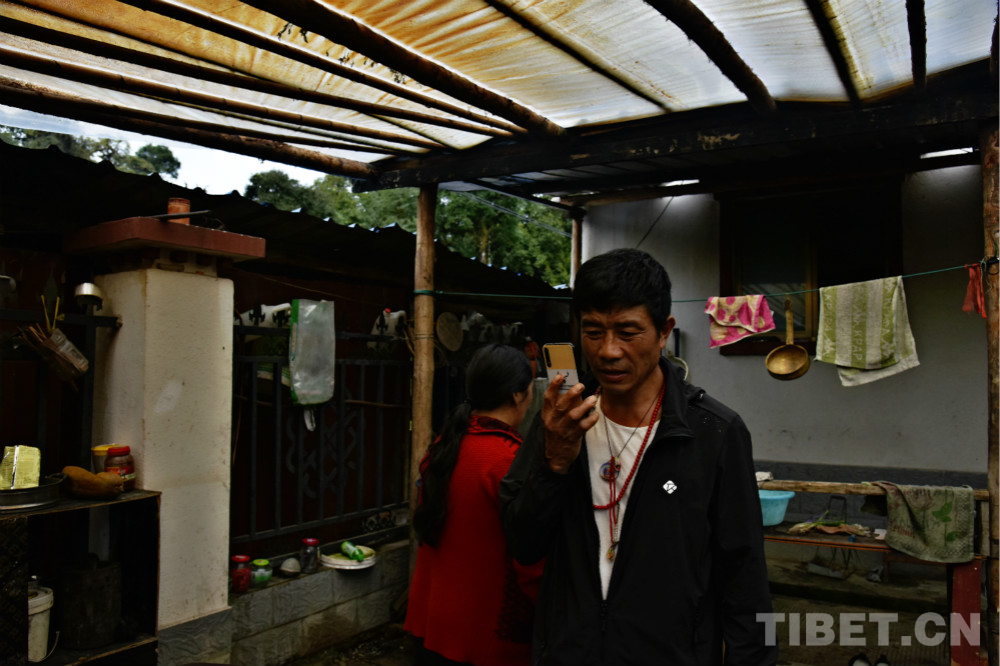 圖為(wei) 西藏自治區林芝市墨脫鎮朗傑崗村村民高東(dong) 在院中涼棚下接電話 攝影:王媛媛