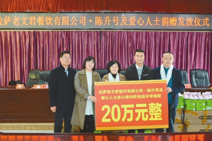 10月 28日,拉薩老文君餐飲有限公司·陳升號及相關(guan) 愛心人士向薩迦縣中學捐贈405雙價(jia) 值68445元的運動鞋,並達成20萬(wan) 元捐款意向,用於(yu) 薩迦中學教育發展。