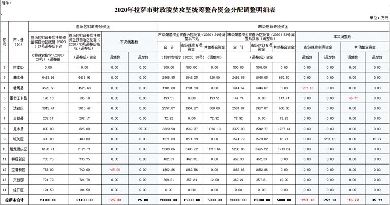 附件:2020年拉薩市財政脫貧攻堅統籌整合資金分配調整明細表