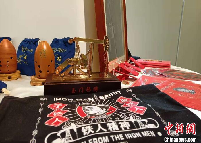 圖為(wei) “鐵人”王進喜故裏甘肅玉門以“鐵人精神”製作的文創產(chan) 品展示。 張婧 攝