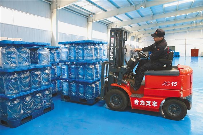 圖為(wei) 在山南市雅礱天然飲品公司,當地村民次仁歐珠正搬運大桶水。 記者次珍攝