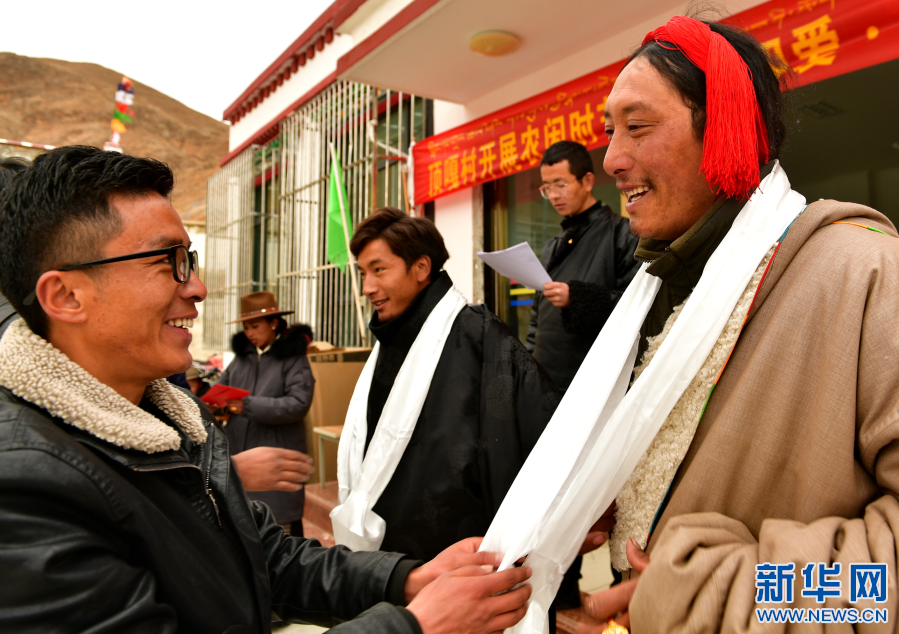 西藏拉薩市堆龍德慶區德慶鄉(xiang) 頂嘎村駐村第一書(shu) 記紮西達傑(左)為(wei) 參加文娛活動的獲獎村民頒獎並佩戴哈達(2019年2月28日攝)。新華社記者 張汝鋒 攝
