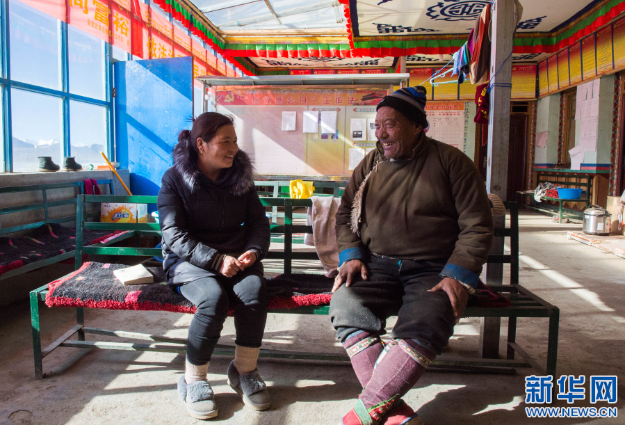 西藏山南市浪卡子縣堆瓦村,35歲的駐村幹部貢曲(左),向60歲的堆瓦村村民索朗紮西了解生活情況(2017年2月9日攝)。新華社記者 普布紮西 攝