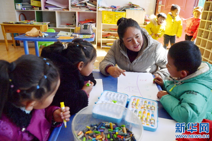 在西藏山南市貢嘎縣吉雄鎮紅星社區雙語幼兒(er) 園,老師次央(左三)指導孩子們(men) 繪畫(11月25日攝)。新華社記者 張汝鋒 攝