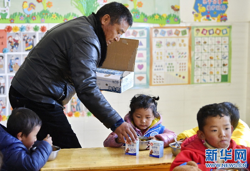 西藏山南市貢嘎縣吉雄鎮紅星社區雙語幼兒(er) 園的老師為(wei) 孩子們(men) 分發牛奶(11月25日攝)。新華社記者 張汝鋒 攝