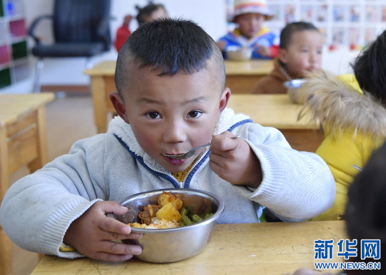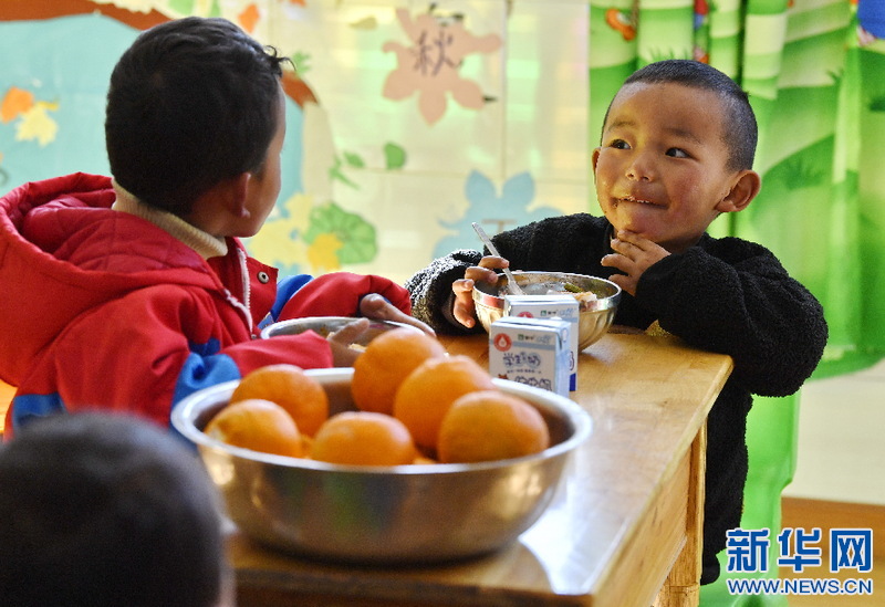 西藏山南市貢嘎縣吉雄鎮紅星社區雙語幼兒(er) 園的孩子吃午餐(11月25日攝)。新華社記者 張汝鋒 攝