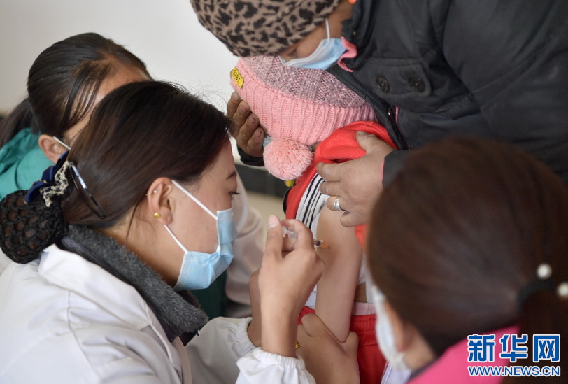 在西藏山南市貢嘎縣吉雄鎮紅星社區便民服務中心,縣疾控中心的醫生為(wei) 小朋友接種疫苗(11月25日攝)。新華社記者 張汝鋒 攝