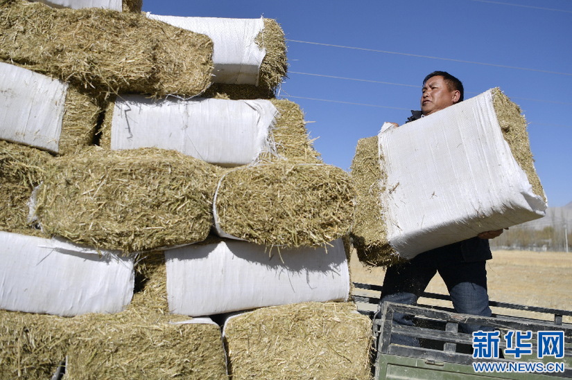 西藏山南市貢嘎縣吉雄鎮紅星社區致富帶頭人、奶牛養(yang) 殖基地負責人邊巴碼放冬儲(chu) 飼草(11月25日攝)。新華社記者 張汝鋒 攝