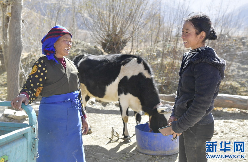 西藏山南市貢嘎縣吉雄鎮紅星社區居民玉珍(右)和鄰居卓瑪嘎日在院子外聊天(11月25日攝)。新華社記者 張汝鋒 攝