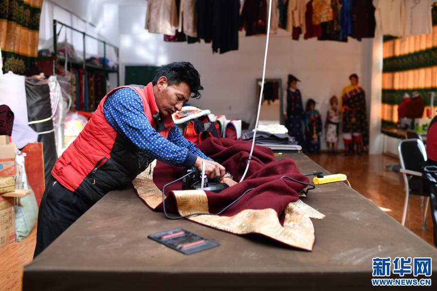 在西藏昌都市江達縣格桑花民族服飾加工銷售公司,江達縣字嘎鄉(xiang) 塔字村村民紮西江措在製作藏裝(4月30日攝)。紮西江措學習(xi) 製作藏裝不到兩(liang) 年時間,已經是一名熟練的製衣工,現在每個(ge) 月有4000多元的收入。新華社記者 詹彥 攝