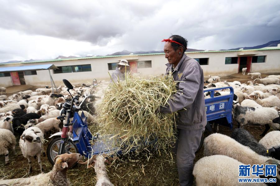 西藏日喀則市定日縣克瑪鄉(xiang) 幫布村村民頓珠在定日縣珠穆朗瑪崗巴羊規模化養(yang) 殖產(chan) 業(ye) 園喂羊(7月31日攝)。頓珠2020年來到產(chan) 業(ye) 園打工,負責喂羊、打掃羊舍,每個(ge) 月有3500元的收入。新華社記者 詹彥 攝