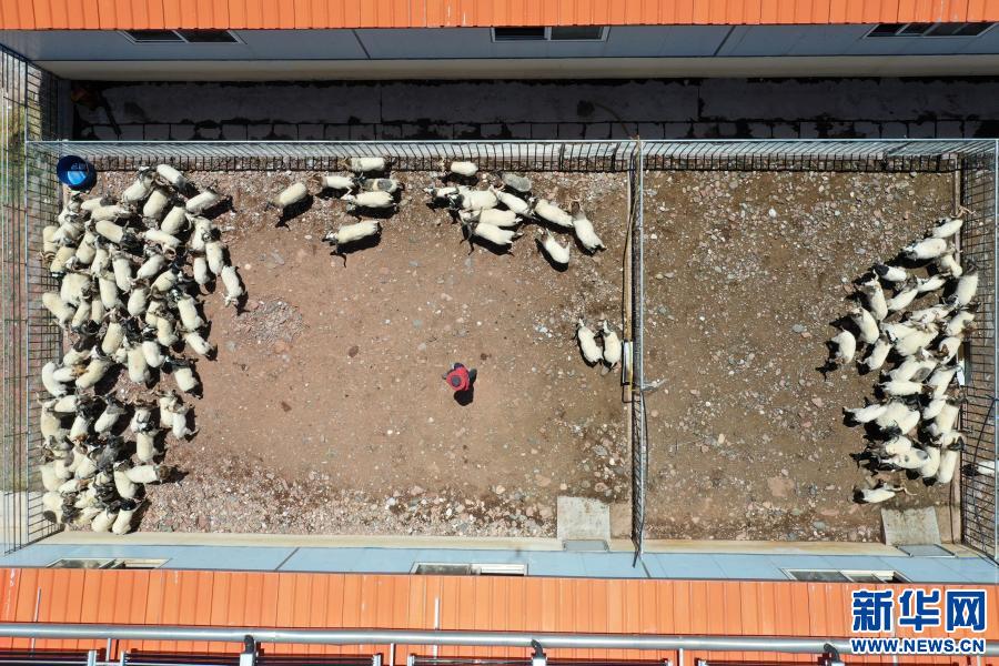 在西藏昌都市貢覺縣莫洛鎮阿旺綿羊繁育基地,阿果村村民色秋在查看綿羊的生長情況(5月2日攝,無人機照片)。2016年,色秋來到阿旺綿羊繁育基地打工,很快就學會(hui) 了綿羊的養(yang) 殖技術,現已成為(wei) 繁育基地的一把好手,月工資漲到了4400元。新華社記者 詹彥 攝