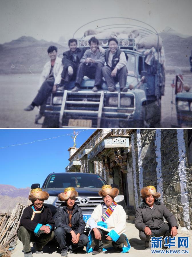 拚版照片:上圖:1994年,24歲的強巴(右二)和他的三個(ge) 兄弟在西藏阿裏地區跑運輸時,在自己購買(mai) 的“東(dong) 風”牌運輸車前合影(強巴提供)。(新華社發)