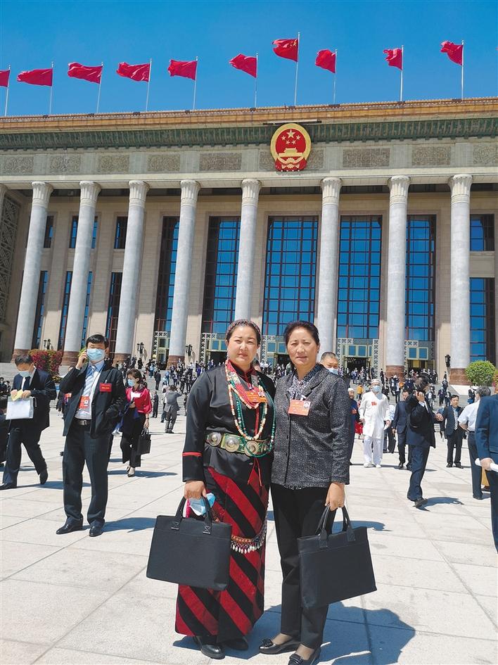 圖為(wei) 貢覺曲珍(左)在會(hui) 場外與(yu) 西藏參會(hui) 委員合影留念。(圖片由貢覺曲珍提供)