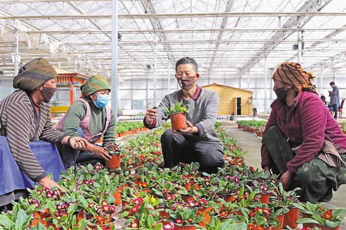 林周縣陽光溫室示範園區技術人員在指導村民種植花卉。