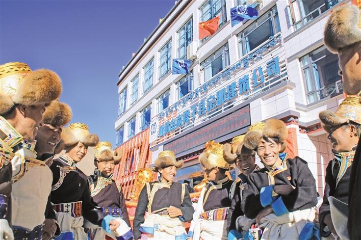 隆子縣宗那建築公司新辦公樓前,農(nong) 牧民務工人員慶祝企業(ye) 喬(qiao) 遷。