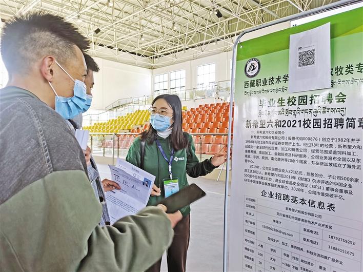 圖為(wei) 西藏職業(ye) 技術學院2021屆農(nong) 牧類專(zhuan) 業(ye) 畢業(ye) 生校園招聘會(hui) 現場,新希望六和股份有限公司工作人員向學生介紹招聘信息。記者 王莉 攝