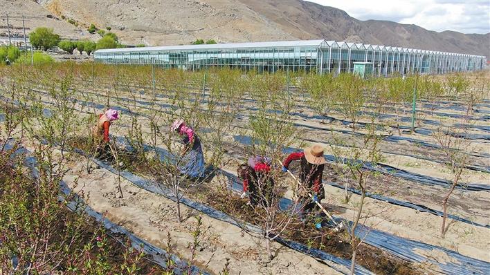 圖為(wei) 當地群眾(zhong) 在卡如鄉(xiang) 大桃種植基地裏幹農(nong) 活。記者 裴聰 格桑倫(lun) 珠 攝