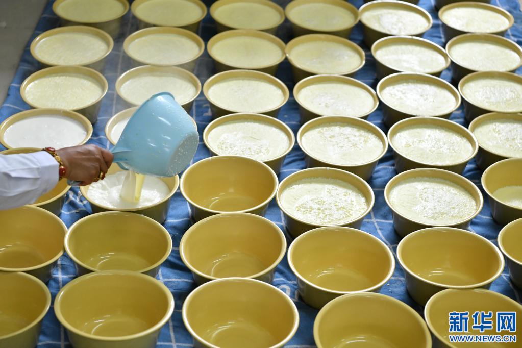 西藏娘亞(ya) 犛牛養(yang) 殖產(chan) 業(ye) 發展有限責任公司的員工在製作傳(chuan) 統手工酸奶(7月28日攝)。新華社記者 李鑫 攝