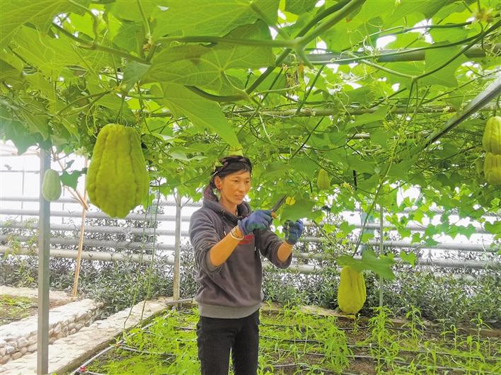 圖為(wei) 在日喀則珠峰現代農(nong) 業(ye) 科技創新博覽園內(nei) ,工作人員正在修剪佛手瓜的枝葉。記者 陳林 攝