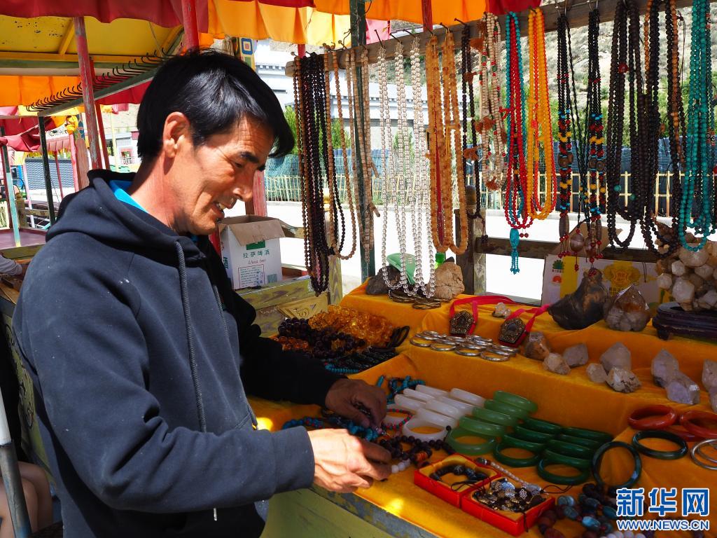 西藏山南市乃東(dong) 區門中崗社區居民頓珠白瑪在自己的工藝品攤位上(6月24日攝)。新華社記者 金一清 攝