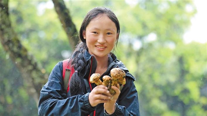 圖為(wei) 尼屋鄉(xiang) 村民德珍從(cong) 山裏采摘了大量鬆茸,臉上洋溢著豐(feng) 收的喜悅。記者 萬(wan) 靖 謝偉(wei) 曲珍 攝