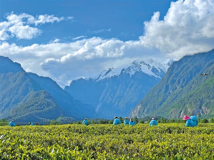 天朗氣清,茶韻悠悠。西藏林芝波密縣易貢茶場裏,油菜花開得正豔;廣袤的湖畔牧場上,馬牛成群;茶農(nong) 們(men) 穿梭在茶林間,他們(men) 身挎茶簍,兩(liang) 手並用,掐準“一葉一茶”,快速放入簍裏,舉(ju) 手低頭間,茶簍逐漸被裝滿。