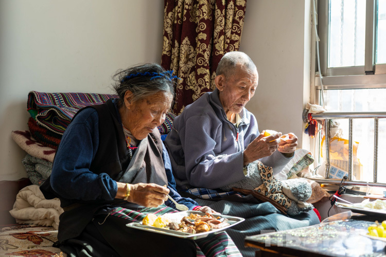 圖為(wei) 次旦(右)和老伴德慶曲珍正在吃午餐 攝影:趙耀