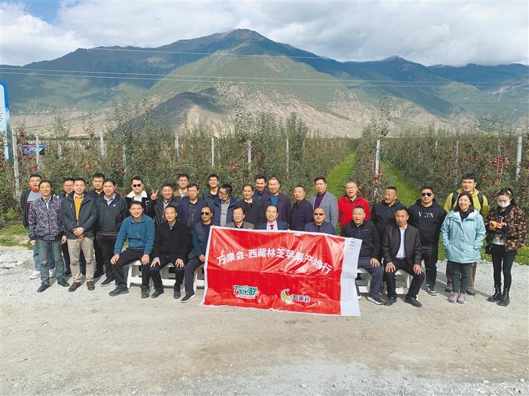 圖為(wei) 采購商們(men) 在林芝現代蘋果標準化園區內(nei) 合影。記者 張猛 胡文 攝