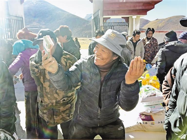 圖為(wei) 嘉黎縣夏瑪鄉(xiang) 坡爾倉(cang) 村村民洛桑拿到分紅後,喜笑顏開。 記者 萬(wan) 靖 攝
