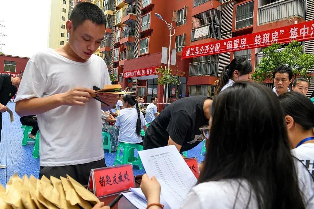 2021年6月,四川省巴中市通江縣公租房民生家園,工作人員為(wei) 居民發放鑰匙。