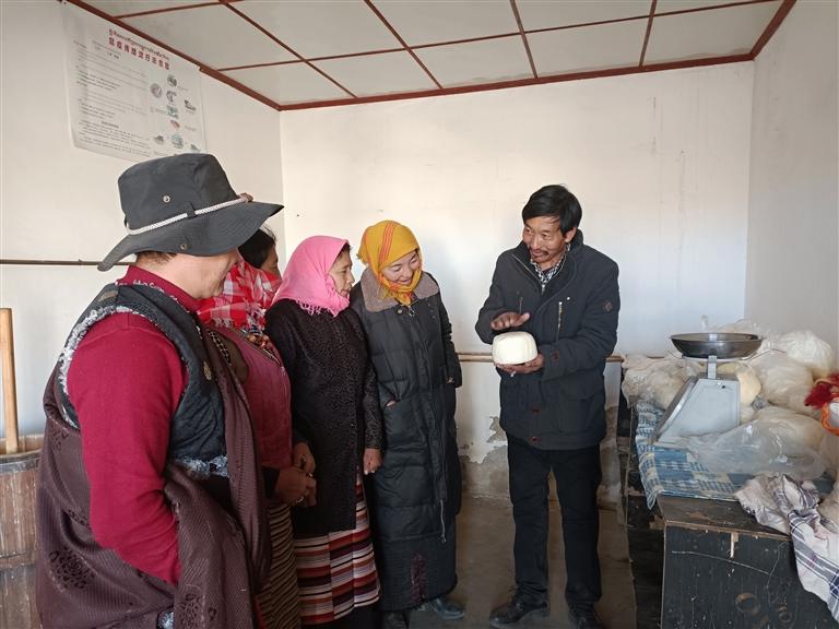 馬村草場遼闊,有著養(yang) 殖犏牛等牲畜的良好自然條件。以前該村由於(yu) 一直依靠傳(chuan) 統方式養(yang) 牛,規模小、科技含量低、品種老化、產(chan) 業(ye) 帶動力不明顯,一直處於(yu) “家家養(yang) 牛家家窮”的狀態。2013年,在拉薩市委組織部(駐村工作隊)的幫扶下,投入90萬(wan) 元成立了堆龍德慶區馬鎮馬村平措犏牛養(yang) 殖合作社。接下來的幾年不斷擴大養(yang) 殖規模和提高養(yang) 殖經營水平,建成了馬村高原特色犏牛養(yang) 殖及乳製品加工銷售一體(ti) 化養(yang) 殖基地,其乳製品深受市場的歡迎。目前,合作社有犏牛100多頭,帶動5人就業(ye) ,2019年起除了與(yu) 其他村集體(ti) 經濟收入一起給常住戶分紅外,每年向本村建檔立卡貧困戶分紅。“我們(men) 村經過發展,成立了犏牛養(yang) 殖合作社,合作社的收入一年比一年好。今年,村集體(ti) 經濟為(wei) 我們(men) 脫貧戶每戶分紅2900元,我們(men) 特別開心。今後也希望能更多地參與(yu) 到村集體(ti) 發展中,學好技術,讓家庭條件越來越好。”村民洛桑高興(xing) 地說。